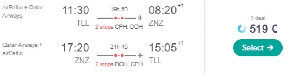 Qatar Airways pakub hetkel hea hinnaga lennupileteid Tallinnast Sansibarile. Edasi-tagasi lennupiletid on saadaval alates 519€ eest ning saadavust leiab märtsist kuni juuni alguseni ja alates augusti lõpust kuni oktoobrini. Lendudel on mõlemal suunal kaks ümberistumist Kopenhaagenis ja Dohas ning lennupiletite hinna sees on kuni 30kg äraantavat pagasit.. Parima hinnaga lennupiletid leiad üles läbi Skyscanneri