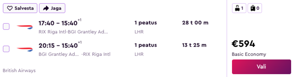 British Airways koostöös airBalticuga pakuvad hetkel suurepärase hinnaga lennupileteid Barbadosele. Soodsaimad edasi-tagasi lennupiletid Riiast on saadaval alates 594€ eest. Miinuseks on minnes pikem ümberistumine Londonis, mis annab ka võimaluse selle linnaga tutvumiseks.