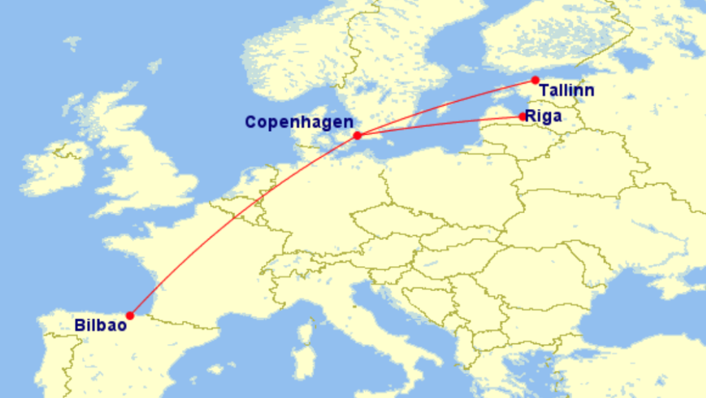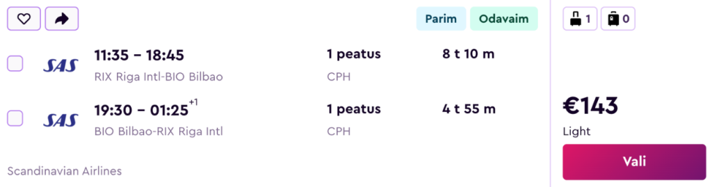 SAS pakub väga hea hinnaga lennupileteid Baskimaale. Edasi-tagasi lennupiletid Riiast Bilbaosse on saadaval alates 143€ eest ja lendudel on üks kiire ümberistumine Kopenhaagenis. Sarnase hinnaga lennupileteid leiab ka algusega Tallinnast, aga sel juhul on tagasiteel tarvis öö veeta Kopenhaagenis (u. 9h). Näide 28.08 - 02.09