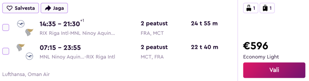 Lufthansa koostöös airBalticu ja Oman Airiga pakuvad hetkel suurepärase hinnaga lennupileteid Filipiinidele. Edasi-tagasi lennupiletid Riiast Manilasse on saadaval alates 596€ eest ning lendudel on kaks ümberistumist Frankfurdis ja Muscatis.
