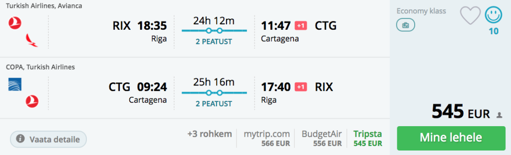 Riia – Cartagena – Riia alates 545€Tihtipeale on kiirete ümberistumistega lennud vaid mõnevõrra kallimad.