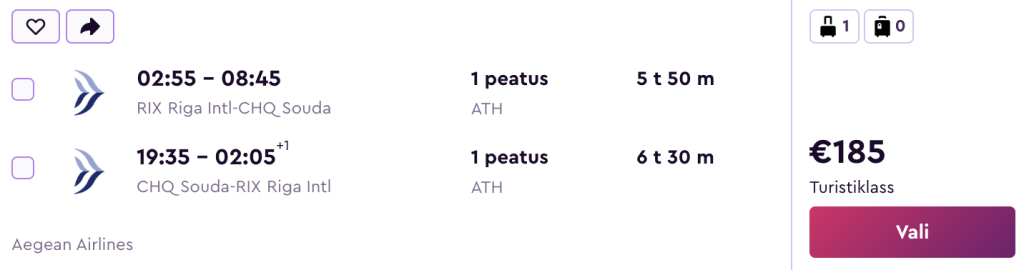 Aegean pakub hetkel väga hea hinnaga lennupileteid suveks ja suve pikendamiseks Kreeta saarele. Kiirete ümberistumistega edasi-tagasi lennupiletid Riiast Iraklio või Chania lennujaama on saadaval alates 165€ eest.