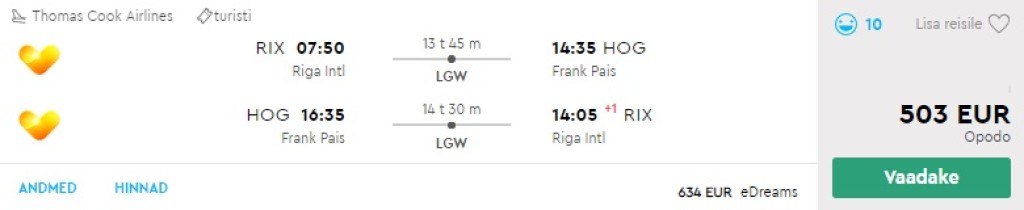 Hetkel on saadaval väga hea hinnaga lennupiletid Kuubale! Edasi-tagasi lennupiletid Riiast Holguini on saadaval alates 503€ eest ning valikus on soodsaid lennupileteid septmebris-oktoobris. Lennud mõlemal suunal ühe mugava ümberistumisega Londonis ning hinnas sisaldub äraantav pagas. Piletiteni jõudmiseks kliki allolevatel näidiskuupäevadel või kontrolli endale sobivaid kuupäevi läbi momondo.ee