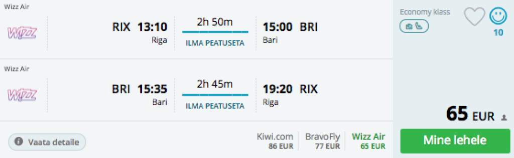 Wizzair pakub hetkel väga hea hinnaga lennupileteid Riiast Lõuna-Itaaliasse, Barisse. Edasi-tagasi lennupiletid on saadaval alates 65€ eest. Tegemist on otselendudega. Otsisime välja kõik soodsad lennupiletid kus hinnad jäävad kuni 100€ piiresse.