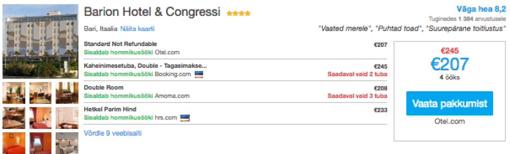 Hotellipakkumised BarisKui otsid soodsa hinnaga öömaja, siis soovitame parima ülevaate ja hinna saamiseks kasutada hotellihindade võrdlusportaali Hotelscombined.ee. Parimate pakkumiste leidmiseks soovitame teha hotellibroneering võimalikult varakult! Järgnevalt meie soovitus vahemikuks 08.05-12.05.