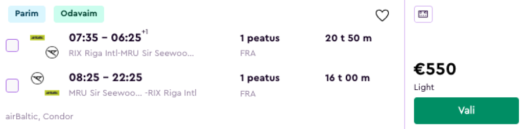 Condor pakub hetkel väga hea hinnaga lennupileteid Mauritiusele. Edasi-tagasi lennupiletid Riiast on saadaval alates 550€ eest ning hea hinnaga lennupileteid leiab novembris ja detsembris. Lennud on mõlemal suunal ühe ümberistumisega Frankfurdis ja lennupiletite hinnas on ka äraantav pagas (20kg). Parima hinnaga lennupiletid leiad üles otsides läbi Momondo.ee