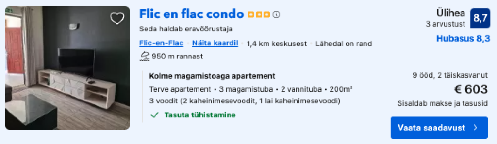 Kui otsid soodsa hinnaga majutust Mauritiuse saarel, siis soovitame parima ülevaate ja hinna saamiseks kasutada majutushindade võrdlusportaali Booking.com