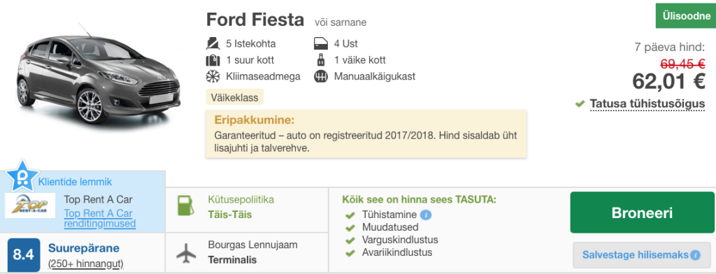 Rendiauto Burgase lennujaamastKindlasti soovitame rentida kohapeal olles rendiauto ning vaadata ringi ka mujal Musta mere ääres. Soodsaima rendiauto leidmiseks Burgase lennujaamast soovitame kasutada Rentalcars.comNäiteks leiab hetkel Ford Fiesta nädalaks ajaks vahemikus 06.10-13.10 62€ eest.