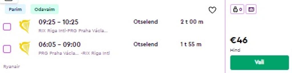 Ryanair pakub hetkel väga hea hinnaga lennupileteid Tšehhi linnareisiks. Edasi-tagasi lennupiletid otselendudele Riiast Prahasse on saadaval alates 46€ eest. Soodsa hinnaga lennupileteid leiab novembriks ja detsembriks. Lennupiletiteni jõudmiseks kliki allolevatel näidiskuupäevadel või kontrolli endale sobivaid lennukuupäevi läbi Momondo.ee