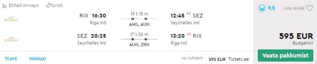 Etihad pakub hetkel väga hea hinnaga lennupileteid Riiast Seišellidele. Edasi-tagasi lennupiletid on saadaval al 595€ eest ning saadaval on ohtralt lennukuupäevi septembrist detsembrini . Piletiteni jõudmiseks kliki allolevatel näidiskuupäevadel või kontrolli endale sobivaid kuupäevi läbi momondo.ee