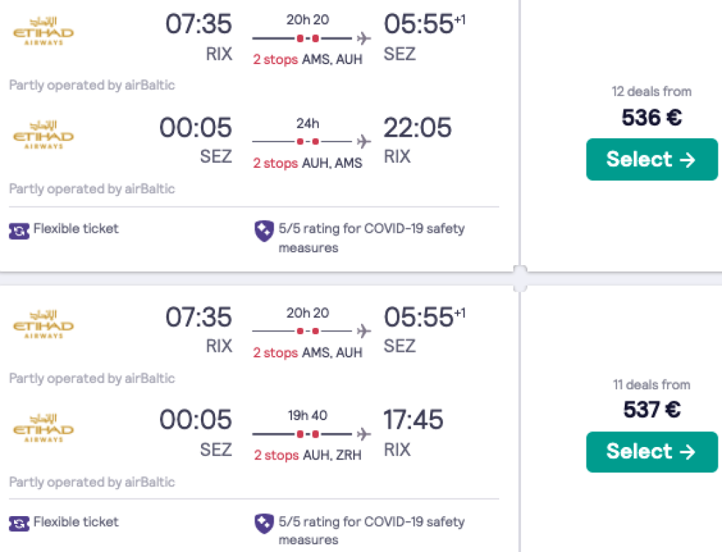 Etihad koostöös airBalticuga pakuvad hetkel väga hea hinnaga lennupileteid Seišellidele. Edasi-tagasi lennupiletid algusega Riiast on saadaval alates 536€ eest ja soodsa hinnaga lennupileteid leiab jaanuarist kuni märtsini. Hinnas sisaldub ka äraantav pagas kaaluga kuni 23kg. Parima hinnaga lennupiletid leiad üles läbi Skyscanneri või kliki allolevatel näidiskuupäevadel.