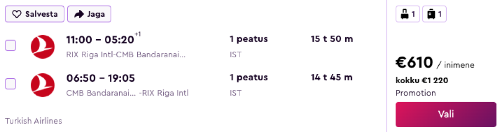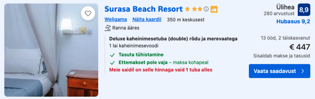 Toome allpool välja ka näite, kuidas saab ise broneerides kahenädalase reisi Sri Lankale kätte vaid 834€ eest (reisides kahekesi). Hinnas sisalduvad lennupiletid Riiast koos äraantava pagasiga ning merevaatega deluxe tuba rannaäärses 3* hotellis (13 ööd).