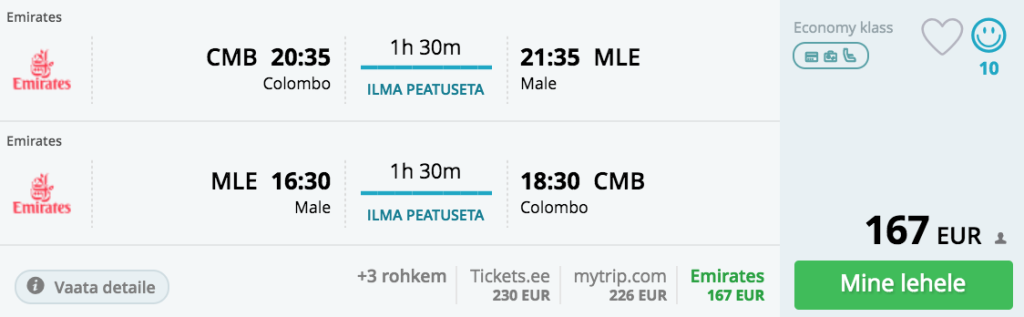 ####Idee: Külasta ühel reisil nii Sri Lankat kui MaldiiveColombo ning Male vahel lendavad mitmed full-service lennufirmad ning hetkel pakub soodsaimat hinda Emirates. Edasi-tagasi lennupiletid Colombost Malesse on saadaval 167€ eest. Parima hinnaga lennupiletid leiad üles läbi Momondo
