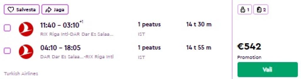 Turkish Airlines pakub hetkel suurepärase hinnaga lennupileteid Tansaaniasse. Edasi-tagasi lennupiletid Riiast India ookeaniäärsesse Dar es Salaami on saadaval alates 542€ eest.