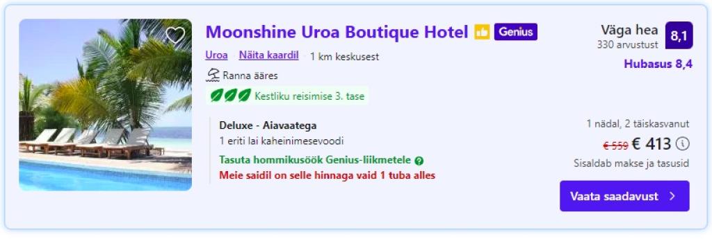 NB! Bookingus kehtivad väga paljudele majutustele Genius-soodustused. Loo kasutaja ning saa osa lojaalsusprogrammi soodustustest.