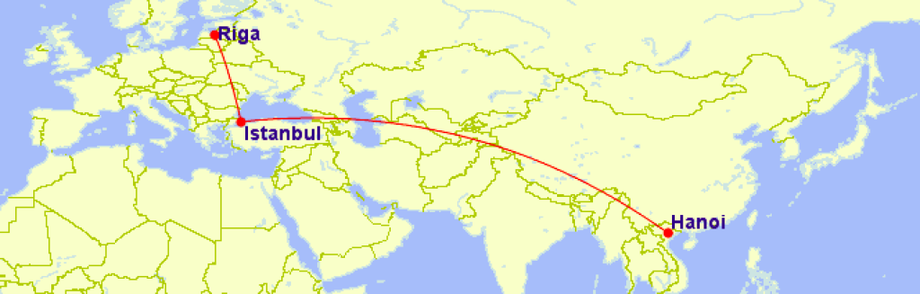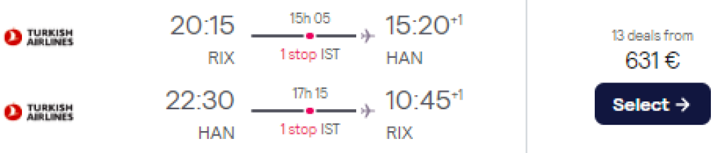 Turkish Airlines pakub hetkel väga hea hinnaga lennupileteid Vietnamisse. Ühe ümberistumsiega edasi-tagasi lennupiletid Riiast Hanoisse on saadaval alates 631€ eest ning hea hinnaga lennupileteid leidub septembrist detsembrini. Lennupiletite hinna sees on nii äraantav pagas kui toitlustamine lennukite pardal. Lennupiletite ostmiseks kliki allpool olevatel näidiskuupäevadel või sisesta need skyscannerisse.