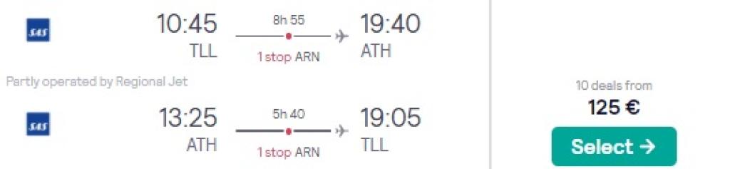 SAS pakub hetkel väga hea hinnaga lennupileteid Kreekasse. Edasi-tagasi lennupiletid Tallinnast Ateenasse leiab üles alates 125€ eest ja saadaval on soodsaid lennukuupäevi augustist novembrini. Lendudel on mõlemal suunal üks ümberistumine Stockholmis või Kopenhaagenis. Parima hinnaga lennupiletid leiad üles läbi Skyscanneri. Või kliki allolevatel näidiskuupäevadel.