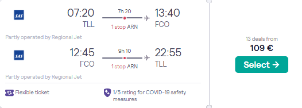 SAS pakub hetkel väga hea hinnaga lennupileteid Itaaliasse. Toome teieni valiku soodsaid lende Veneetsiasse, Rooma, Florence'isse, Milanosse ja Bolognasse. Edasi-tagasi lennupiletid Tallinnast leiab üles alates 108€ eest ja saadaval on soodsaid lennukuupäevi augustist novembrini (sõltuvalt sihtkohast). Lendudel on mõlemal suunal üks ümberistumine Stockholmis või Kopenhaagenis. Parima hinnaga lennupiletid leiad üles läbi Skyscanneri. Või kliki allolevatel näidiskuupäevadel.