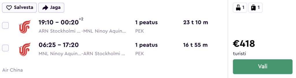 Air China pakub hetkel väga hea hinnaga lennupileteid sügiseks ja talveks Filipiinidele. Edasi-tagasi lennupiletid Stockholmist Filipiinide pealinna Manilasse on saadaval alates 418€ eest.