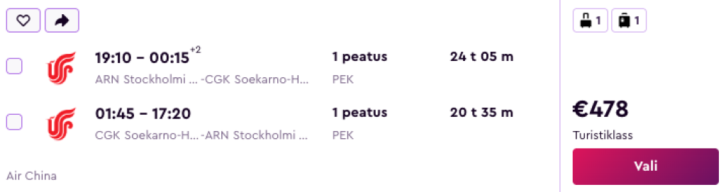 Air China pakub hetkel soodsa hinnaga lennupileteid kevadeks ja sügiseks Indoneesiasse. Ühe ümberistumisega lennupiletid Stockholmist Jakartasse on saadaval alates 478€ eest. Eestlastele kehtib Pekingi lennujaamas viisavaba transiit, mis tähendab, et võib ka korraks Pekingi peale kolama minna. Loe kogemusi Pekingi lennujaama viisavaba transiidi kohta tripi foorumist.