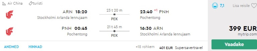 Air China pakub hetkel suurepärase hinnaga lennupileteid Kambodžasse. Edasi-tagasi lennupiletid Stockholmist Phnom Penhi on saadaval vaid 399€ eest ja saadavust leiab alates novembrist kuni märtsini välja. Kombineerides need lennupiletid lendudega Tallinnast Stockholmi, saab edasi-tagasi lennupiletid Tallinnast Phnom Penhi kätte alates 457€ eest. Parima hinnaga lennupiletid leiad üles läbi Momondo.ee või klikkides allolevatel otselinkidel.