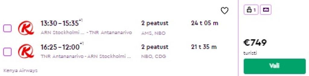Kenya Airways koostöös KLM'i ja Air France'iga pakuvad hetkel väga hea hinnaga lennupileteid Madagaskarile. Edasi-tagasi lennupiletid Stockholmist Antananarivosse on saadaval alates 749€ eest. Lennud on kahe ümberistumisega (Amsterdamis või Pariisis ning Nairobis). Ohtralt soodsa hinnaga lennukuupäevi on saadaval sügiseks ja talveks. Hinnas sisaldub 2 ühikut äraantavat pagasit. Lennupiletiteni jõudmiseks kliki allolevatel lennukuupäevadel või sisesta soovitud kuupäevad momondosse.