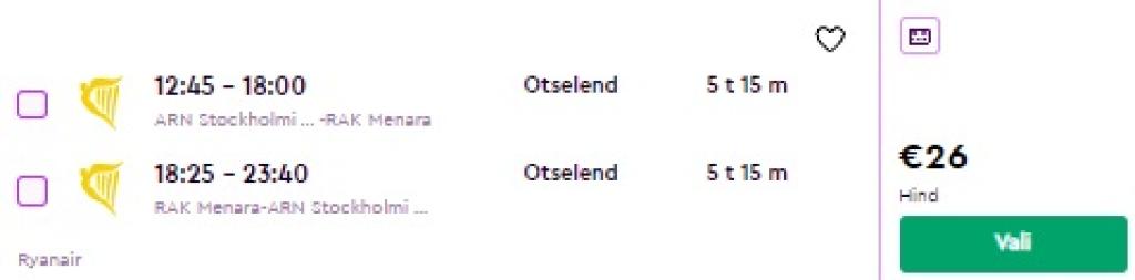 Ryanair alustab sügisel lendamist Stockholm Arlanda lennujaamast Marokosse ja pakub hetkel suurepärase hinnaga lennupileteid. Edasi-tagasi lennupiletid Marrakechi on saadaval alates 26€ eest. Lennud Stockholmi ja Marrakechi vahel toimuvad 2x nädalas kolmapäeviti ja pühapäeviti. Soodsate piletiteni jõudmiseks kliki allolevatel näidiskuupäevadel või otsi endale huvipakkuvad lennupiletid üles läbi Momondo.ee.