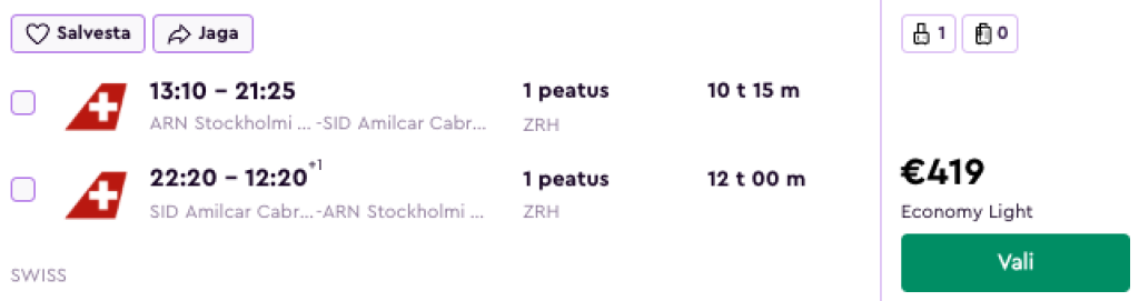 SWISS koostöös Lufthansaga pakuvad hetkel hea hinnaga lennupileteid Atlandi ookeanis asuvale Cabo Verdele, tuntud ka kui Roheneemesaartele. Edasi-tagasi lennupiletid Stockholmist Sali saarele on saadaval alates 419€ ning Boa Vista saarele alates 376€ eest.