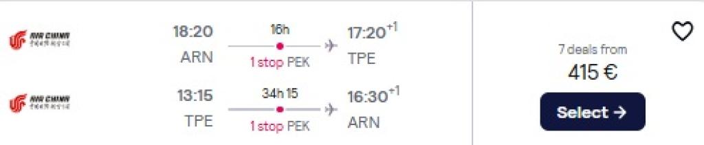 Air China pakub hetkel soodsa hinnaga lennupileteid Taiwani. Ühe ümberistumisega lennupiletid Stockholmist Taipeisse on saadaval alates 415€ eest. Minnes on lennud kiire ümberistumisega Pekingis, tagasiteel on pikem peatus Pekingis.
