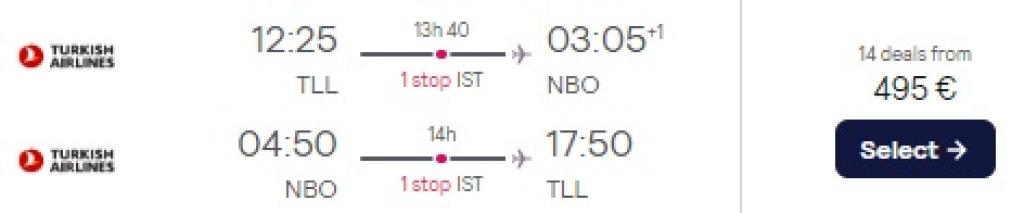 Turkish Airlines pakub hetkel soodsa hinnaga lennupileteid sügiseks ja talveks Keeniasse. Edasi-tagasi lennupiletid Tallinnast on saadaval al 495€ eest ning hea hinnaga lennupileteid leiab novembrist märtsini. NB: saadaval ka head lennukuupäevad jõuludeks ja aastavahetuseks! Lennupiletite hinnas sisaldub toitlustamine lennukite pardal ning äraantav pagas! Lennupiletite ostmiseks kliki allpool olevatel näidiskuupäevadel või kontrolli sobivaid lennukuupäevi läbi läbi Momondo.ee.