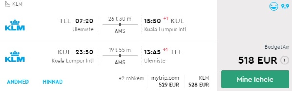 Hetkel võid leida väga hea hinnaga lennupileteid sügiseks ja talveks Malaisiasse. Edasi-tagasi lennupiletid Tallinnast Kuala Lumpurisse on saadaval alates 500€ eest. Ohtralt soodsa hinnaga lennupileteid KLM'iga või Turkish Airlinesiga leiad oktoobrist märtsini. Kõik meie poolt välja otsitud lennupiletid ühe ümberistumistega mõlemal suunal.