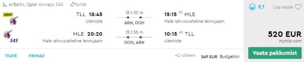 Qatar Airways pakub hetkel väga hea hinnaga lennupileteid Tallinnast Maldiividele. Edasi-tagasi lennupiletid on saadaval 520€ eest ning saadaval on ohtralt lennukuupäevi augustist aprillini. Piletiteni jõudmiseks kliki allolevatel näidiskuupäevadel või kontrolli endale sobivaid kuupäevi läbi momondo.ee