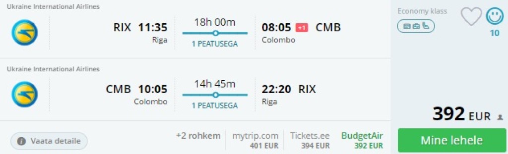 UIA pakub hetkel väga hea hinnaga lennupileteid Riiast Sri Lankale. Edasi-tagasi lennupiletite hinnad Colombosse on alates 392€ eest. Saadaval on soodsaid lennukuupäevi oktoobrikuus. Lennud on mõlemal suunal ühe ümberistumisega ja hinna sees on nii äraantav pagas kui toitlustamine pardal. Soodsate lennupiletite ülesleidmiseks kliki allolevatel otselinkidel või kontrolli endale sobivaid kuupäevi läbi Momondo.ee