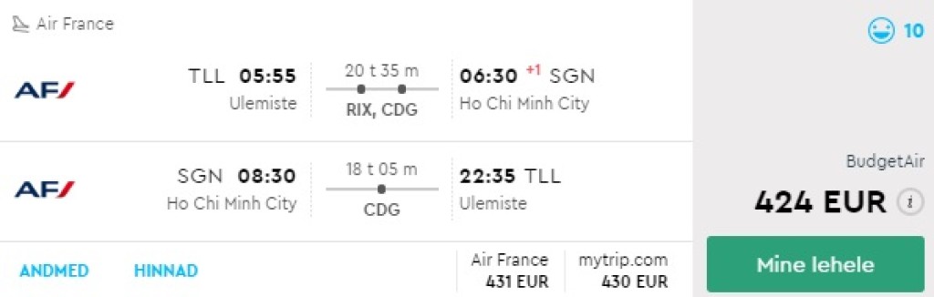 Air France pakub hetkel väga hea hinnaga lennupileteid sügiseks Vietnami. Edasi-tagasi lennupiletid Tallinnast Ho Chi Minh Citysse on saadaval alates 424€ eest. Soodsa hinnaga lennupileteid leiab septembrist kuni detsembrini. Kõige parem saadavus on septembris. Kõik meie poolt välja otsitud lennupiletid on kiirete ümberistumistega.