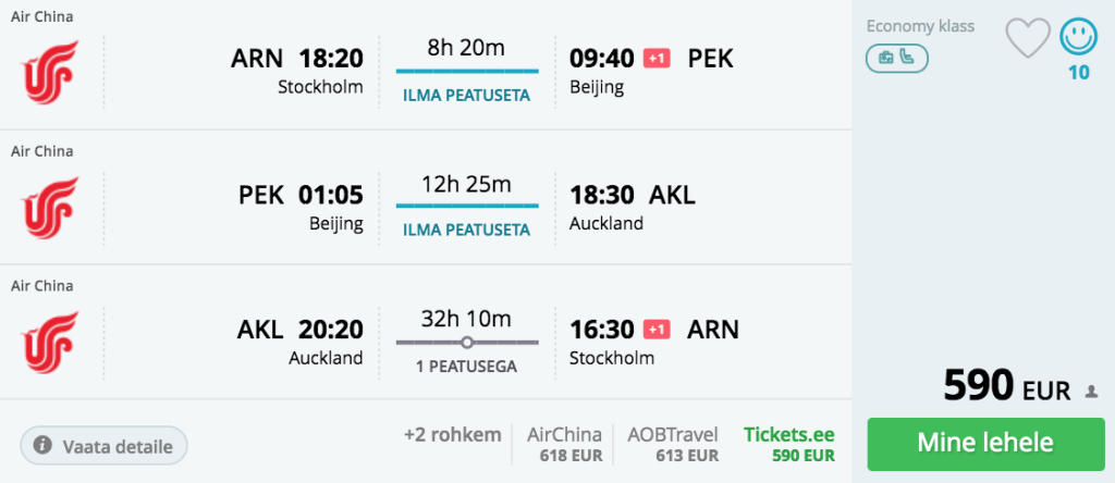 Air China pakub hetkel hea hinnaga lennupileteid nii Helsingist kui Stockholmist Uus-Meremaale. Edasi-tagasi lennupiletid on saadaval alates 581€ eest. Huvitavam variant võiks olla külastada lisaks Uus-Meremaale ka Pekingit. Hinnavahe on kümmekond eurot ning Peking on 144h viisavaba.