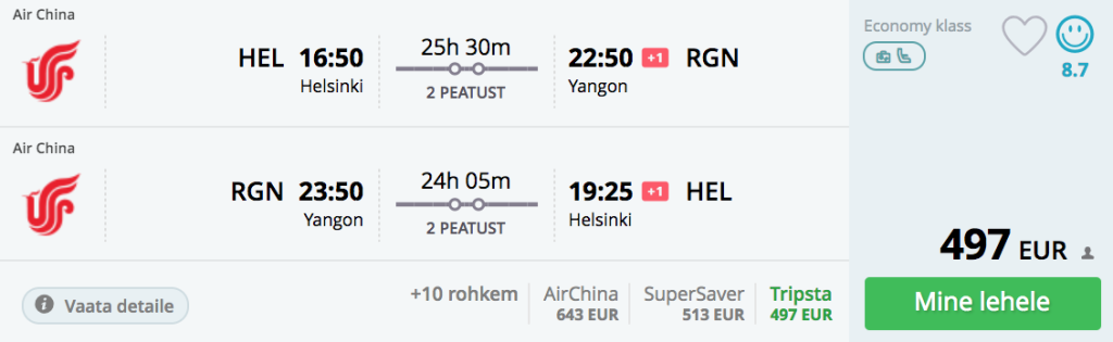 Stockholm-Yangon-Stockholm 469€Kehtivad kõik samad kuupäevad, mis ka Helsingist. Mine Momondo.ee ning sisesta endale huvi pakkuvad kuupäevad