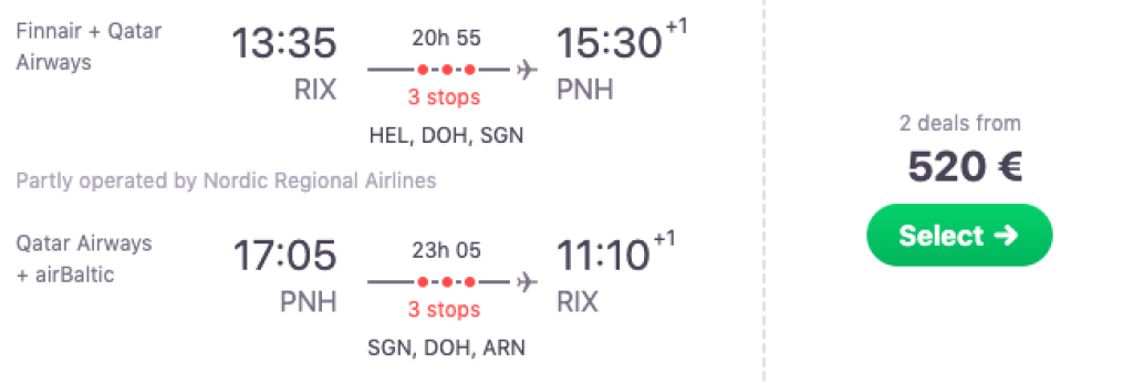 Maailma parim lennufirma Qatar Airways pakub hetkel suurepärase hinnaga lennupileteid Riiast Kambodžasse. Edasi-tagasi lennupiletid Riiast Kambodža pealinna Phnom Penhi on saadaval alates 520€ eest. Soodsa hinnaga lennupileteid leiab alates augusti lõpust kuni aprillini välja. Piletiteni jõudmiseks kliki allpool olevatel näidiskuupäevadel või kontrolli endale sobivaid lennukuupäevi läbi Skyscanneri