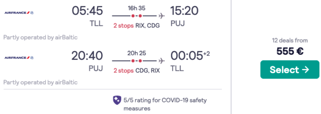KLM/Air France pakuvad hetkel väga hea hinnaga lennupileteid Tallinnast Dominikaani Vabariiki. Edasi-tagasi lennupiletid Tallinnast Punta Canasse on saadaval alates 555€ eest ning saadavust leiab alates augusti lõpust kuni järgmise aasta suveni välja. Lendude ümberistumised toimuvad olenevalt lennukuupäevadest Helsingis, Riias, Pariisis, Amsterdamis või Santo Domingos. Parima hinnaga lennupiletid leiad üles läbi Skyscanneri, aga meie soovitus on minna lennufirma kodulehele ja soetada lennupiletid otse lennufirmalt vaid mõnevõrra kallimalt.