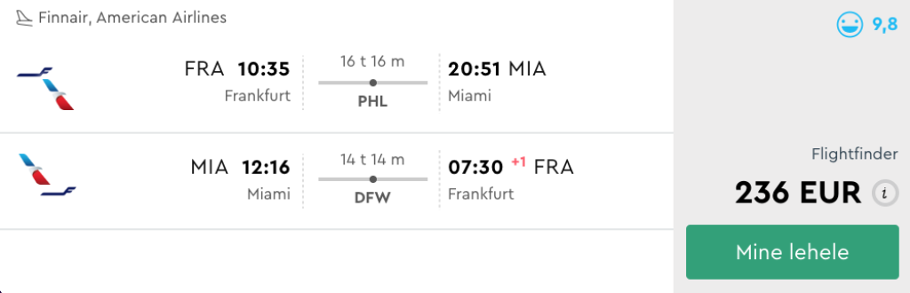 Frankfurt-Miami-Frankfurt alates 236€Jälgi kindlasti, et lennud toimuksid peale 10am, siis jõuab Lufthansaga ilusti Tallinnast Frankfurti.Soodsa hinnaga lennupiletid on saadaval lendamaks alates 23.08.2018 kuni 28.03.2019 (välja arvatud jõulud ja aastavahetus).