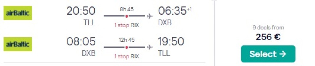 airBaltic pakub hetkel väga hea hinnaga lennupileteid sügiseks Tallinnast Dubaisse. Ühe ümberistumisega edasi-tagasi lennupiletid on saadaval alates 256€ eest ning hea hinnaga lennupileteid leiab sügiseks. Toome allpool välja vaid mõned näidiskuupäevad, saadavust leiab ka teisteks kuupäevadeks. Parima hinnaga lennupiletid leiad üles läbi Skyscanneri.