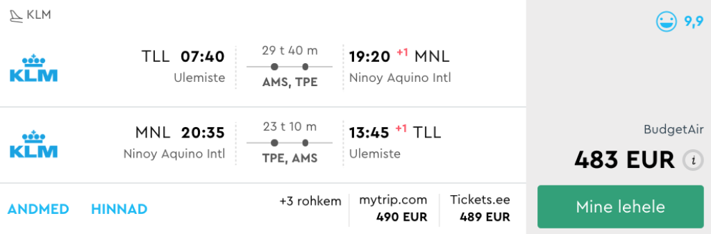 KLM koostöös airbalticu, Philippine Airlinesi ja Cathayga pakuvad hetkel väga hea hinnaga lennupileteid Tallinnast Filipiinidele. Edasi-tagasi lennupileteid Tallinnast Manilasse leiab üles alates 483€ eest. Miinuseks on minnes pikem (8-11h) vahepeatus Amsterdamis, mis annab võimaluse linnaga tutvumiseks. Ööbima Amsterdamis ei pea!