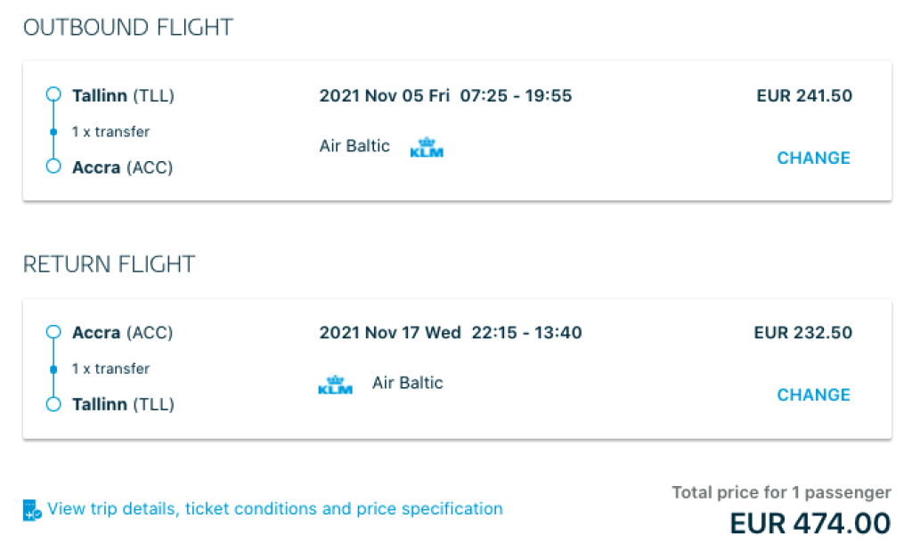 KLM koostöös airBalticu ja Finnairiga pakuvad hetkel väga hea hinnaga lennupileteid Tallinnast Ghanasse. Edasi-tagasi lennupiletid Ghana pealinna Accrasse on saadaval alates 474€ eest ning saadavust leiab maist kuni detsembri alguseni. Toome allpool välja näidiskuupäevad sügiseks. Lennud on enamjaolt ühe ümberistumisega Amsterdamis ning lennupiletite hinna sees on nii toitlustamine KLMi pardal kui ka äraantav pagas (kuni 23kg).
