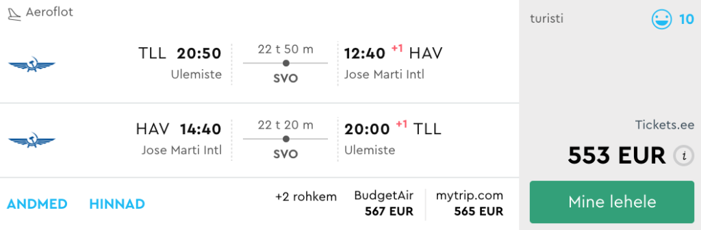 Aeroflot pakub hetkel hea hinnaga lennupileteid sügiseks Riiast ning Tallinnast Kuubale. Edasi-tagasi lennupiletid Havannasse on saadaval Tallinnast hinnaga 553€ ning Riiast hinnaga 560€. Saadavust leiab septembrist kuni detsembri alguseni. Lennugraafikust tulenevalt on Tallinnast lennates pikad (8-9h) ümberistumised Sheremetyevo lennujaamas. Seetõttu on tunduvalt mugavam variant lennata Riiast. Lennupiletite ostmiseks kasuta allpool olevaid näidiskuupäevi või otsi need ise läbi Momondo.ee