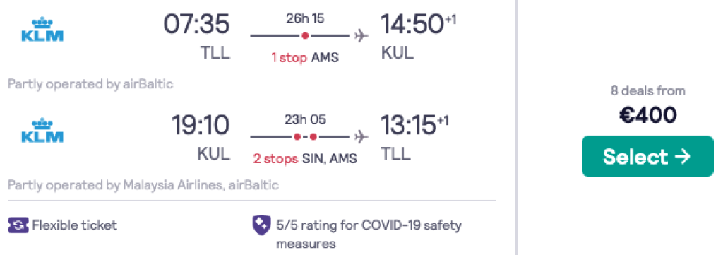 KLM pakub hetkel hea hinnaga lennupileteid Tallinnast Malaisiasse. Edasi-tagasi lennupiletid Tallinnast Kuala Lumpurisse on saadaval alates 400€ eest ning saadavust leiab juba alates kevadest kuni sügiseni välja. Toome välja näidiskuupäevad sügiseks, kuna hetkel pole veel teada kas Malaisia kevadel oma piirid avab. Lendudel on olenevalt kuupäevadest 1-2 ümberistumist. Piletiteni jõudmiseks kliki allolevatel näidiskuupäevadel või kontrolli endale sobivaid kuupäevi läbi Skyscanneri