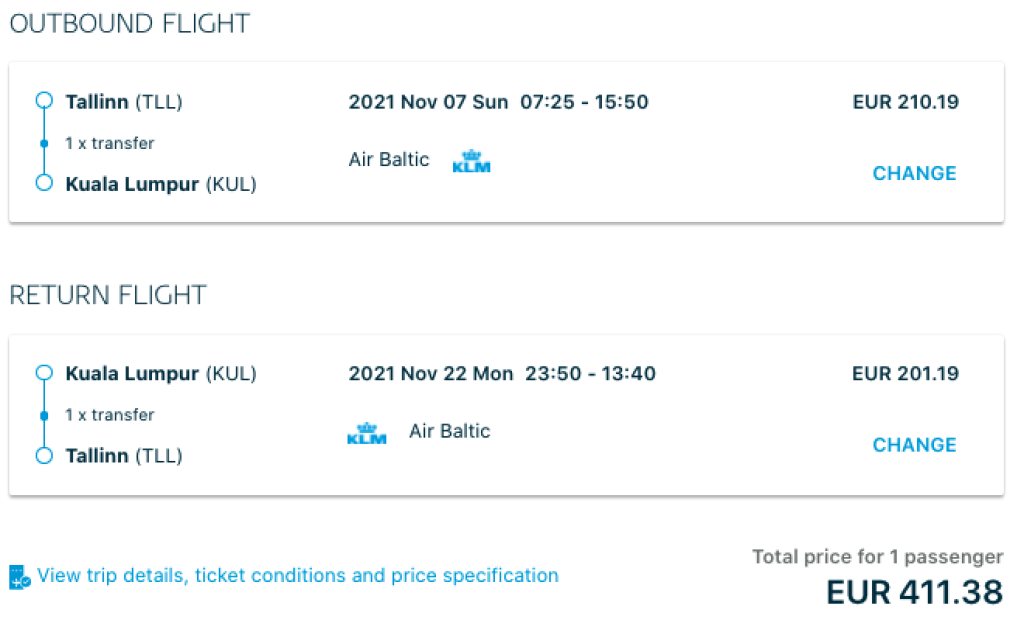 KLM/Air France pakuvad hetkel atraktiivse hinnaga lennupileteid sügiseks Tallinnast Malaisiasse. Edasi-tagasi lennupiletid Tallinnast Kuala Lumpurisse on saadaval alates 411€ eest ning saadavust leiab mais-juunis ning augusti lõpust kuni novembri lõpuni. Toome välja näidiskuupäevad sügiseks, kuna hetkel pole veel teada kas Malaisia kevadel oma piirid avab. Lendudel on olenevalt kuupäevadest 1-2 ümberistumist. Piletiteni jõudmiseks kliki allolevatel näidiskuupäevadel või kontrolli endale sobivaid kuupäevi läbi KLMi kodulehekülje