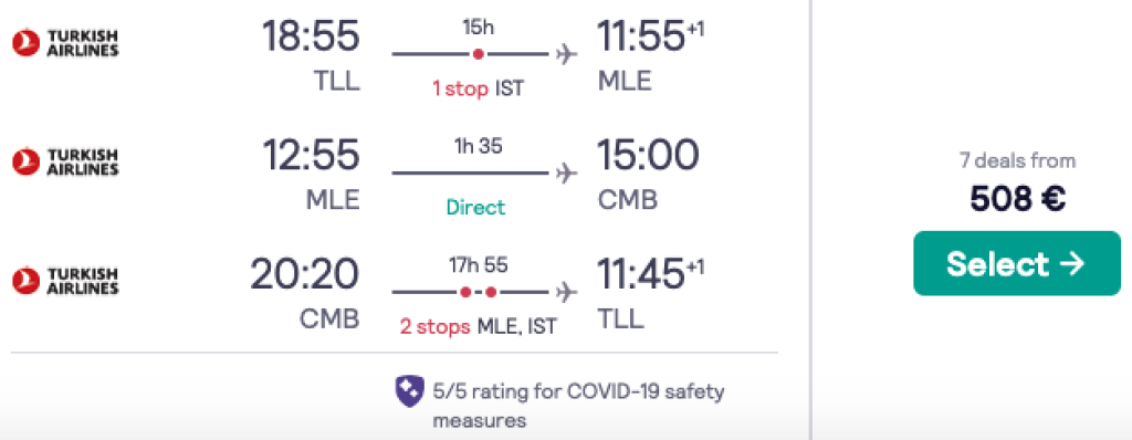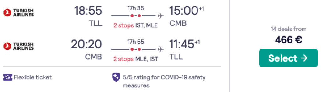 Turkish Airlines pakub hetkel suurepärase hinnaga lennupileteid Tallinnast Sri Lankale. Edasi-tagasi lennupiletid Tallinnast Colombosse on saadaval alates 466€ eest ning saadavust leiab juba alates kevadest kuni detsembrini välja. Lennupiletite hinna sees on ka äraantav pagas ning toitlustamine pardal. Vägagi atraktiivse hinnaga lennupileteid leiab ka külastamaks ühel reisil nii Maldiive kui Sri Lankat, tõime allpool välja ka näite. Soodsate lennupiletiteni jõudmiseks kliki allolevatel näidiskuupäevadel või sisesta endale sobivad lennukuupäevad läbi Skyscanneri