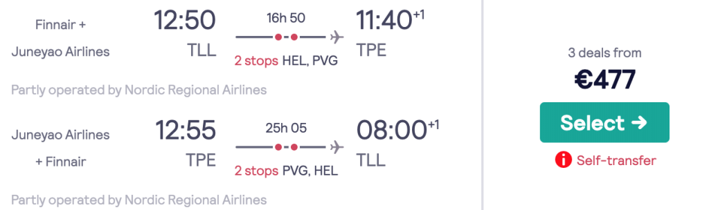 Juneyao Airlines ja Finnair pakuvad hetkel väga hea hinnaga lennupileteid Tallinnast Taiwani. Edasi-tagasi lennupiletid Tallinnast Taipeisse on saadaval alates 477€ eest ning saadavust leidub üksikutel kuupäevadel novembris-detsembris. Lennupiletite hinna sees on nii toitlustamine lennufirmade pardal kui äraantav pagas. Tagasiteel on enamjaolt päevasel ajal pikem ümberistumine Shanghais, mis annab ka võimaluse Shanghaiga tutvumiseks(Shanghai on transiidi puhul eestlastele 144h viisavaba). Piletiteni jõudmiseks kliki allolevatel näidiskuupäevadel või kontrolli endale sobivaid kuupäevi läbi Skyscanneri