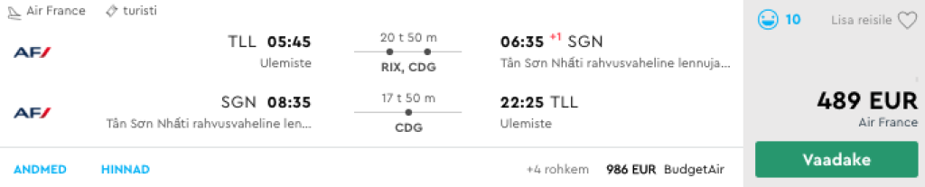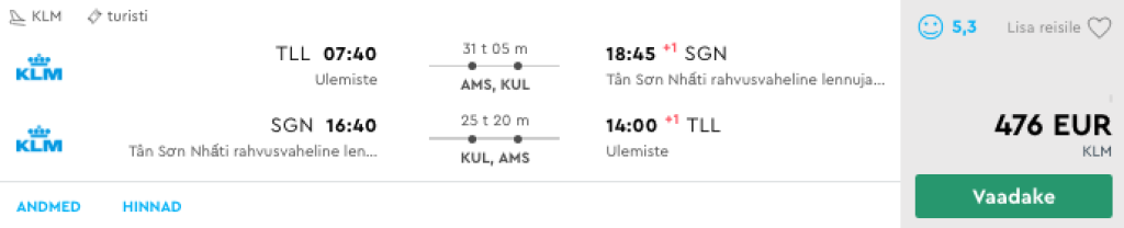 Air France/KLM pakuvad hetkel väga hea hinnaga lennupileteid Vietnami. Edasi-tagasi lennupiletid Tallinnast Ho Chi Minh Citysse on saadaval alates 476€ eest. Soodsa hinnaga lennupileteid leiab alates augusti lõpust kuni detsembri lõpuni (võimalus ka jõulud Vietnamis veeta). Kõige soodsamate lennupiletite puhul toimuvad lennud üle Amsterdami ning sel juhul on minnes kuskil 10-11h ümberistumine, mis annab võimaluse ka minnes Amsterdamiga tutvumiseks. Tagasilennud on kiirete ümberistumistega. Samas leiab kõikidel meie poolt välja otsitud lennukuupäevadel ka kiirete ümberistumistega Air France lennupileteid hinnaga 489€. Piletiteni jõudmiseks kliki allpool olevatel näidiskuupäevadel või kontrolli endale sobivaid lennukuupäevi läbi Momondo.ee
