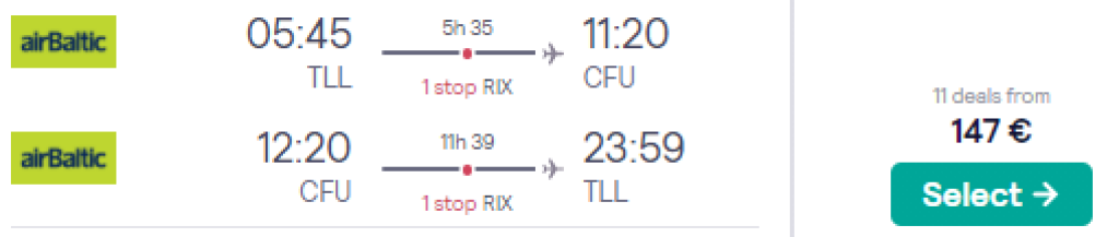 Läti odavlennufirma airBaltic pakub hetkel väga hea hinnaga lennupileteid suveks Korfule. Edasi-tagasi lennupiletid Tallinnast on saadaval alates 147€ eest. Parima hinnaga lennupiletid leiad üles läbi Skyscanneri aga meie soovitus on minna airbaltic.com ja soetada lennupiletid otse lennufirmalt vaid mõnevõrra kallimalt (hinnad Tallinnast alates 165€].