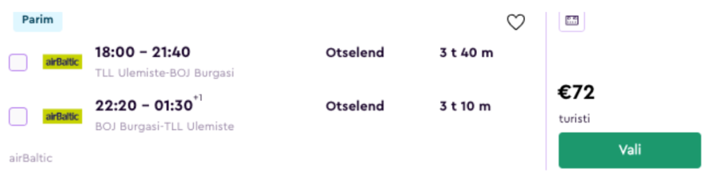 Hetkel leiab suurepärase hinnaga lennupileteid Bulgaariasse. Edasi-tagasi lennupiletid Tallinnast Musta mere äärsesse Burgasesse on saadaval alates 72€ eest. Soodsa hinnaga lennupileteid leiab terveks suveks! Parima hinnaga lennupiletid leiab üles läbi Momondo, aga meie soovitus on minna airBaltic.com ja osta lennupiletid otse lennufirmalt.